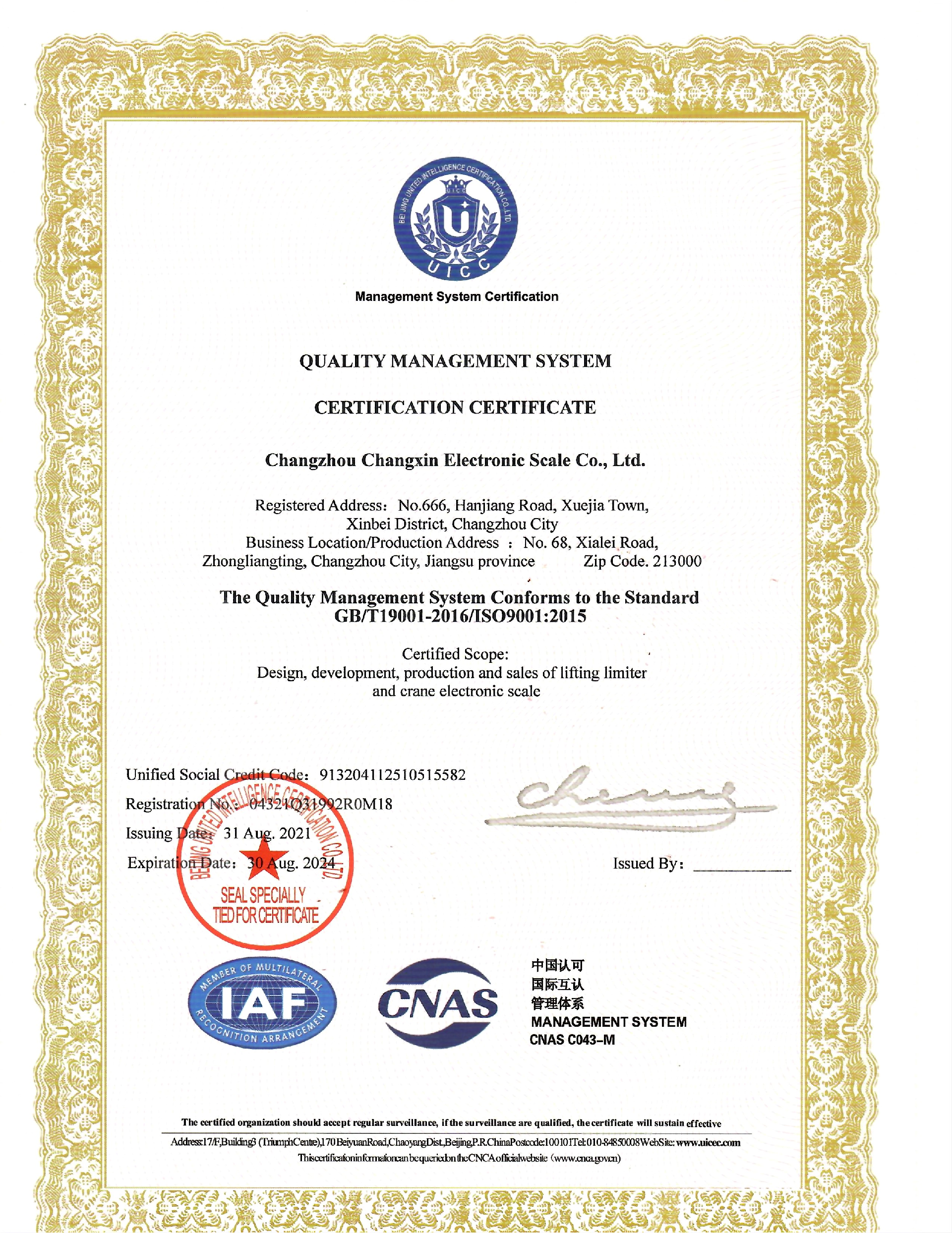 1998年12月,常欣公司率先在同行業(yè)中通過了IS09001質(zhì)量體系的認證。2008年被確認為全國起重機械標準化技術委員會委員,參與制訂